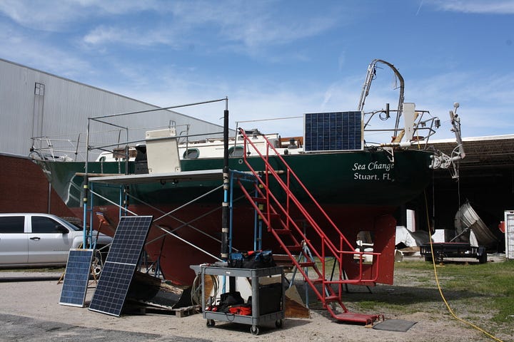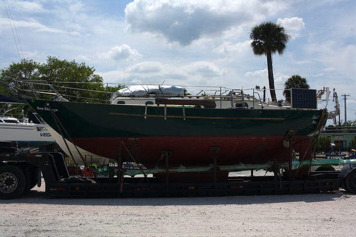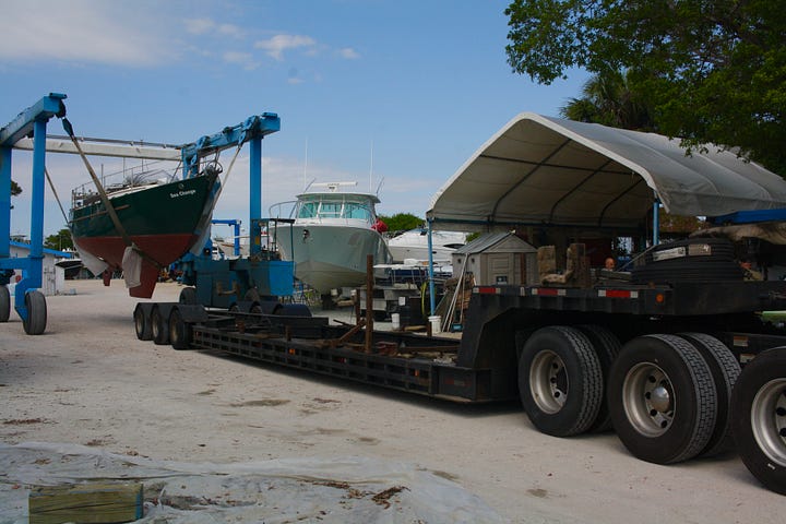 So I spent the days sailing and preparing Sea Change for transport via flatbed truck from Stuart, FL to Washington, NC. A whirlwind of days, unloading, storing, hauling out, unloading gear, strapping down for uncovered road transit. 3 days passed that felt like one. Days in the yard and nights of little sleep thinking of what needs doing. Packed up and strapped down, Sea Change made it safely to her new temporary home in North Carolina.